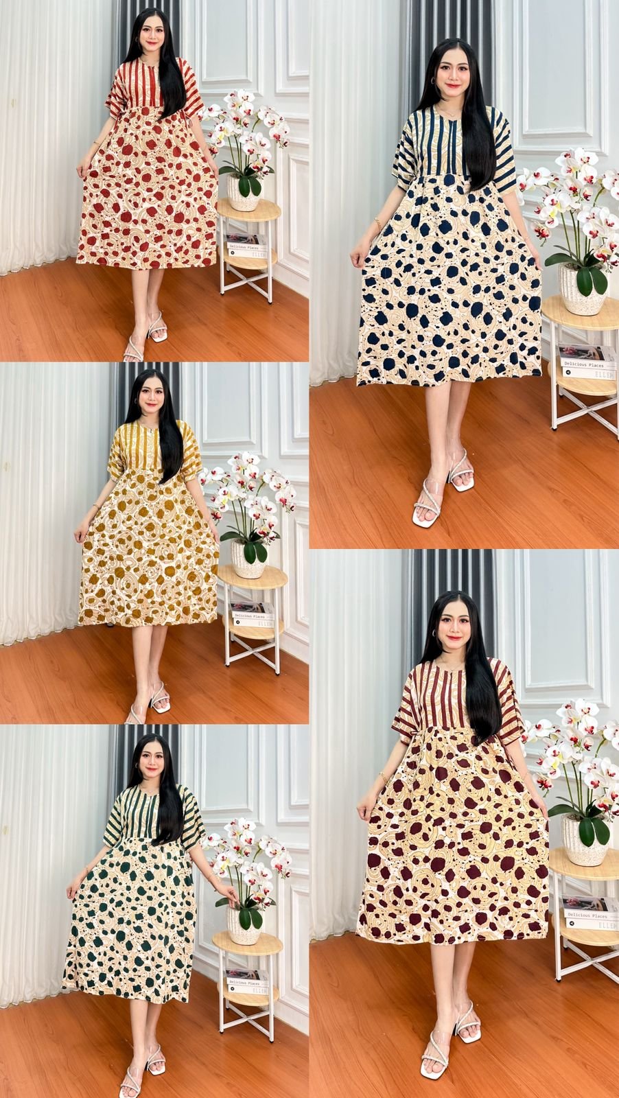 Baju rumahan/homey dress yang enak dilihat dan tidak membosankan. Menggunakan material katun rayon super sehingga nyaman dan adem saat dipakai. Bahan tebal jadi tidak menerawang.