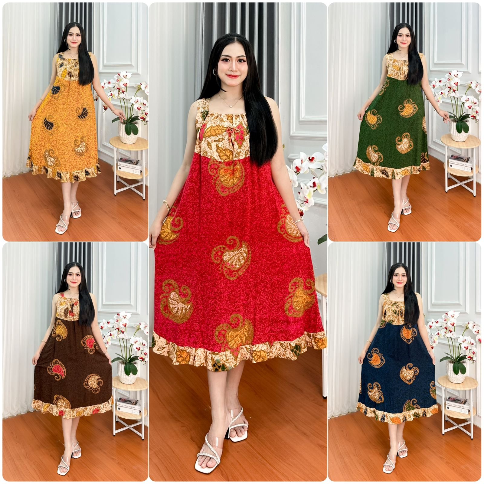 Baju rumahan/homey dress yang enak dilihat dan tidak membosankan. Menggunakan material katun rayon super sehingga nyaman dan adem saat dipakai. Bahan tebal jadi tidak menerawang.